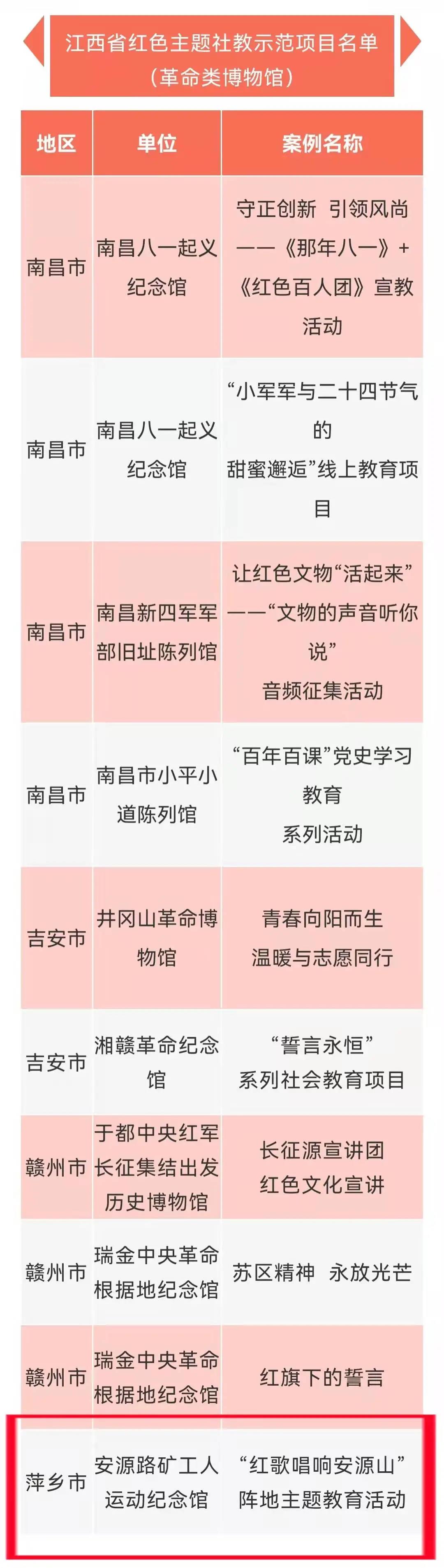 近日,省文化和旅游厅组织开展的2021年度全省百项红色主题社教项目评选结束,评选产生了全省十佳红色主题社教项目,安源路矿工人运动纪念馆名列其中。