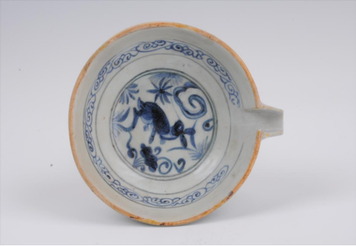 萍乡博物馆收藏的这件元代青花兔纹匜,来自于江西省萍乡市上栗区福田乡硖石村窖藏出土。匜口径13.5、高4.5、足径8.3厘米,其口沿为侈口、弧腹、平底、腹壁齐口沿有一箕形流。器物纹饰内、外壁各绘卷草纹一圈,上下以单线弦纹作栏框,内底心绘兔纹,作回首状,周边绘花草纹六簇,以双线弦纹作栏框。