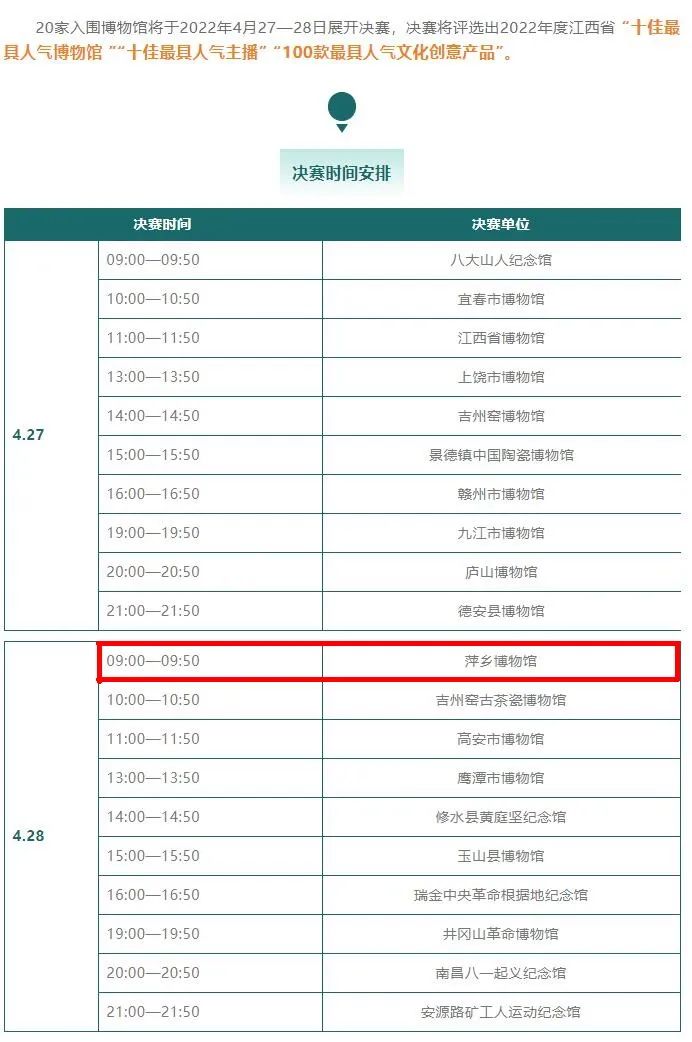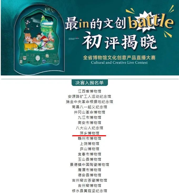 今天江西省博物馆学会公布了“最in的文创 battle——全省博物馆文化创意产品直播大赛“决赛入围名单,萍乡博物馆成功入围,并于4月28日上午9:00-9:50展开决赛。