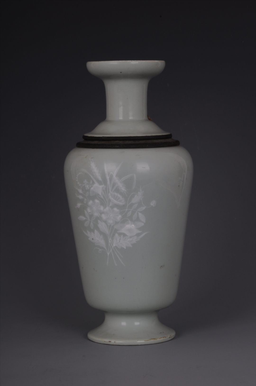 萍乡博物馆收藏的民国豆青釉堆白花铁胆油灯,由原萍乡市文化站移交;瓶口径7.8,足径8.9;铁灯:口径2.8,腹径7.6,残高21.2;铁桶:口径10.1,腹径7.8,高15(cm)一套四件。浅盘口,束颈,溜肩,长腹,束胫,喇叭状足。施豆青釉,腹部堆白釉花卉,麦穗等二束。 整器可分为四件:1、瓶肩以上与瓶体分开,作遮风罩用途,其与腹部交接处安装一铁圈;2、铁皮棒槌式油灯;3、铁皮托灯桶,其上端外折宽沿挂在瓶腹顶部;4、瓶体。