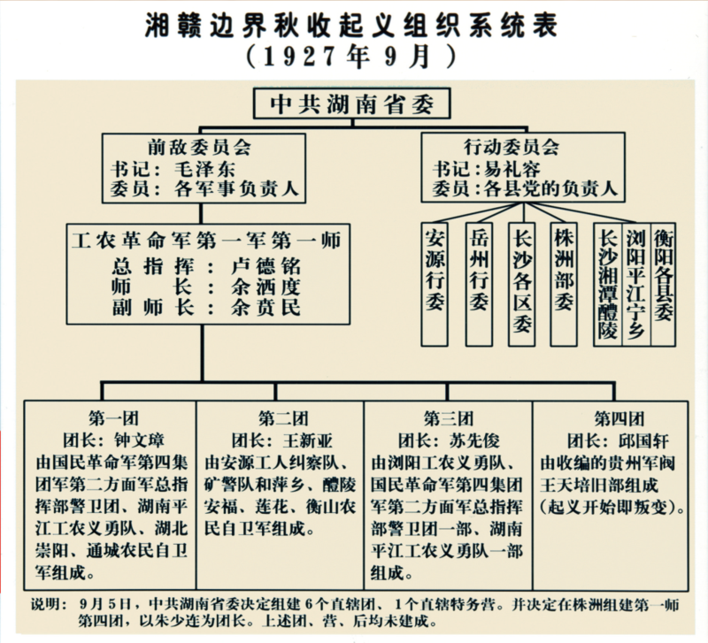 2.确立了部队的建制和名称,将驻修水、安源、铜鼓的部队合编为工农革命军第一军第一师,下辖三个团。