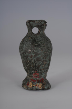 我馆收藏的这件元大德七年造袁州路萍乡州铜权是于1978年在市土产公司杂品仓库收购。通高11.9,腹径5.8,足径5.7厘米。扁方形尖顶钮,圆穿孔,溜肩,腹微鼓,最大腹径在肩下,下腹内收,束胫,喇叭状饼形平足。腹部前后刻“袁州路萍乡州·大德七年造”直书四行铭文。全器使用铸造技法。
