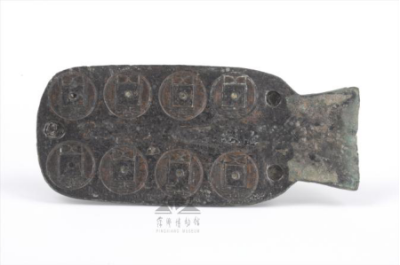 我馆收藏的这件东汉五铢钱铜范通长15.6,宽6.8,厚3.8厘米。1套2件。分公母两范合成。公母两范背面均有两条凹槽,外表附着一层薄青铜,内壁为八枚“五铢”印模。公范为五铢钱的背面,背面无字,只有钱的内外郭。钱为广方穿,方孔中央和外郭边均有排气孔和排气道。公范上部是喇叭状浇注流口,通过流口灌入各钱,双肩及底部共有三个柱状公榫,背面中脊有一个扁方形捉手。母范为五铢钱的正面,有反刻的阴文篆书“五铢”两字,双肩与底部有三个卯榫槽,背面双肩各有一个圆柱形足。“五铢”二字在穿孔两边竖行整齐排列,钱文自右向左对读,字迹清晰规整,“五”字中间两笔交叉缓曲,“铢”字圆折,“金”字只有一半,上笔呈尖三角形。五铢钱直径2.3厘米,穿孔直径1厘米。