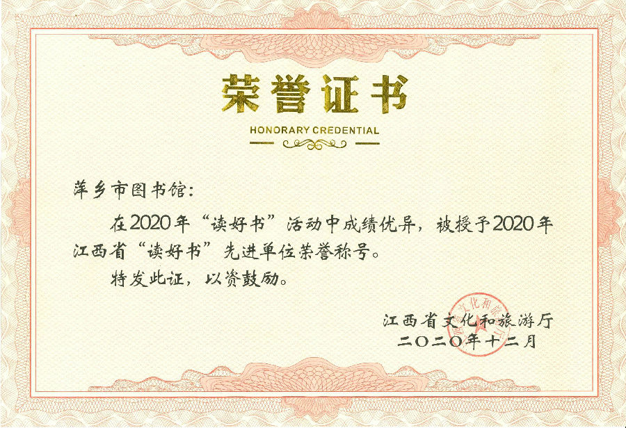 萍乡市图书馆喜获2020年江西省“读好书”活动先进单位等荣誉称号
