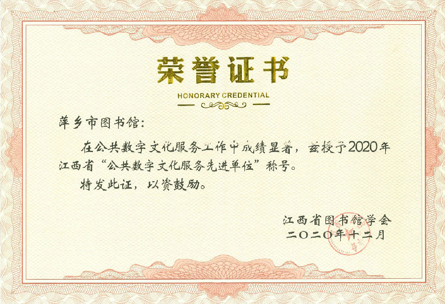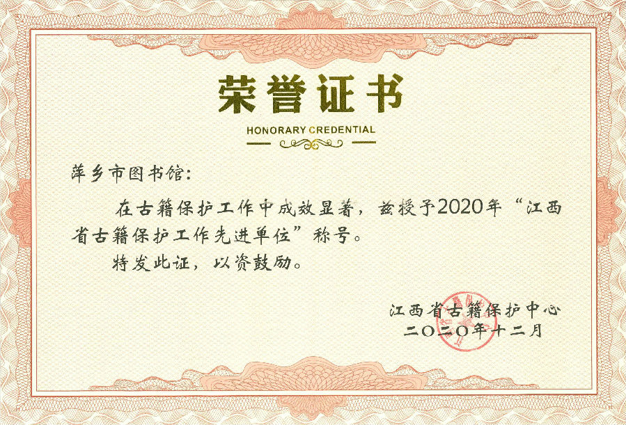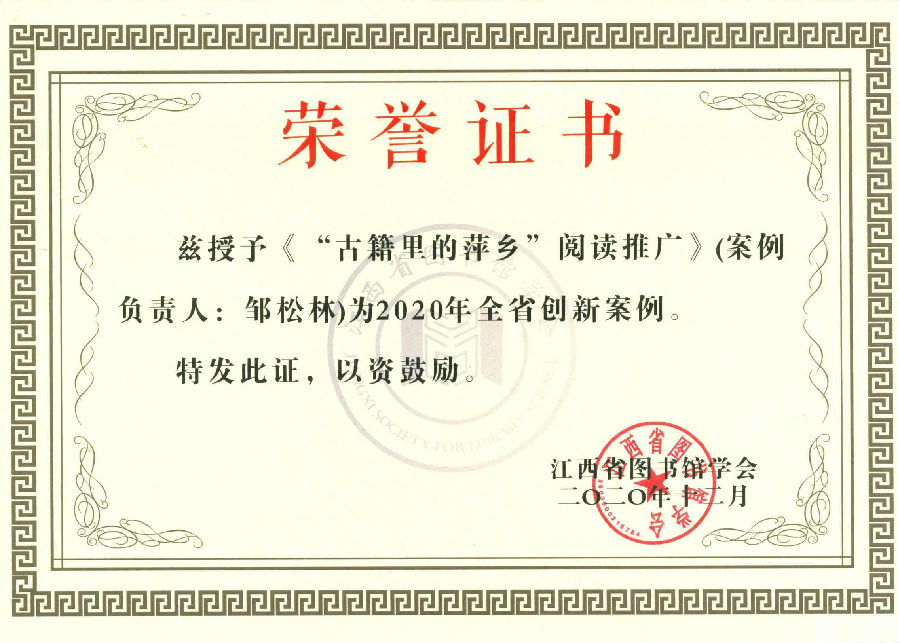2020年12月8日,萍乡市图书馆在2020江西图书馆年会上,荣获了江西省“读好书”活动先进单位、江西省“公共数字文化服务先进单位”、“江西省古籍保护工作先进单位”等荣誉称号,“古籍里的萍乡”阅读推广案例被授予为2020年全省创新案例。