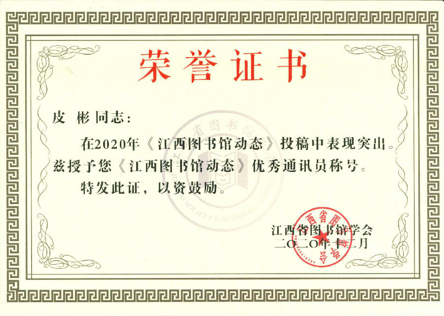 ★皮彬荣获《江西图书馆动态》优秀通讯员称号。