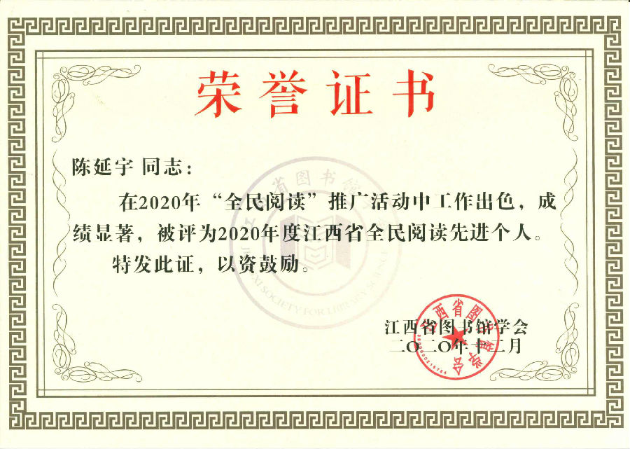 ★陈延宇荣获2020年度江西省全民阅读先进个人称号;