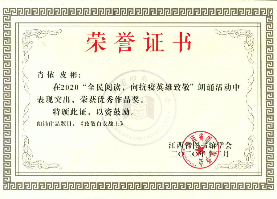 ★肖依和皮彬荣获“全民阅读,向抗疫英雄致敬”朗诵活动优秀作品奖;