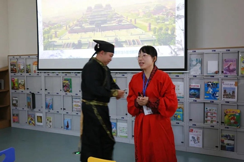 活动开始,主讲老师运用PPT课件,通过声情并茂的讲述使小读者们认识作者,熟悉诗歌的创作背景,感知诗歌意境。老师古装打扮,利用简单的茶具做道具,让小读者们对这首《将进酒》的诗词环境有个切实的体会,老师细心引导小读者们吟诵古诗,感悟浓浓诗意。在与小读者们的对话中,将古诗深入浅出地从句意赏析引申到表达手法,再到古诗所表达的情感与诗人想抒发的感情,启发小朋友们对古诗的感悟和思考。