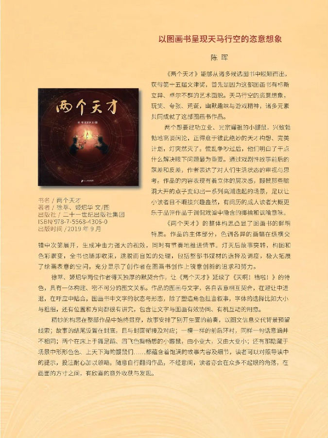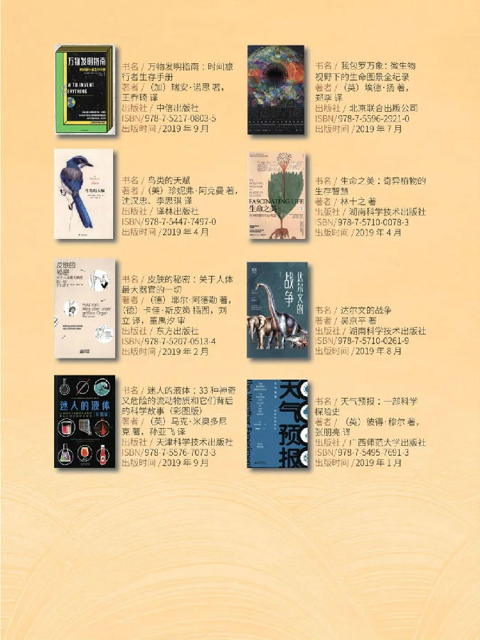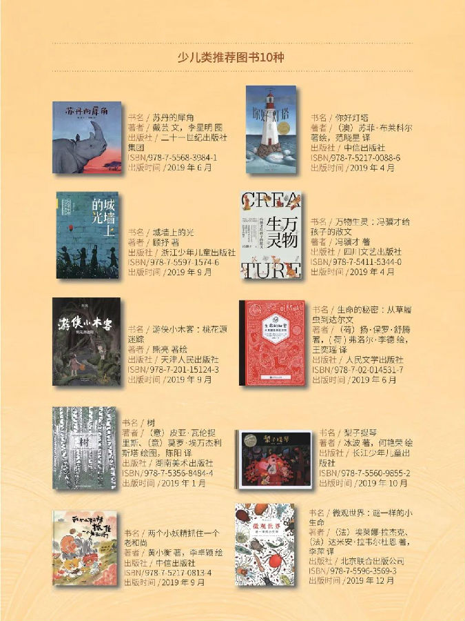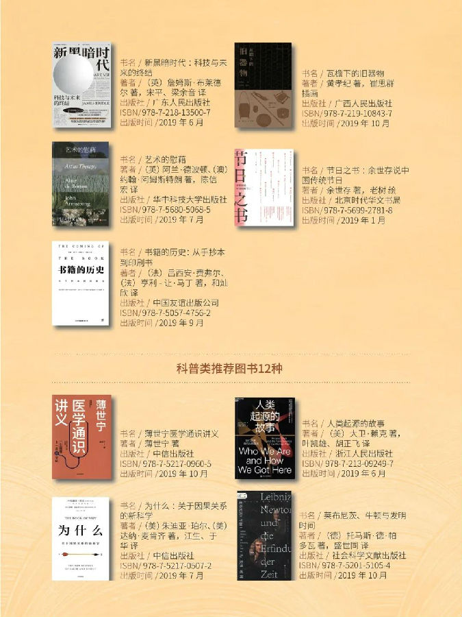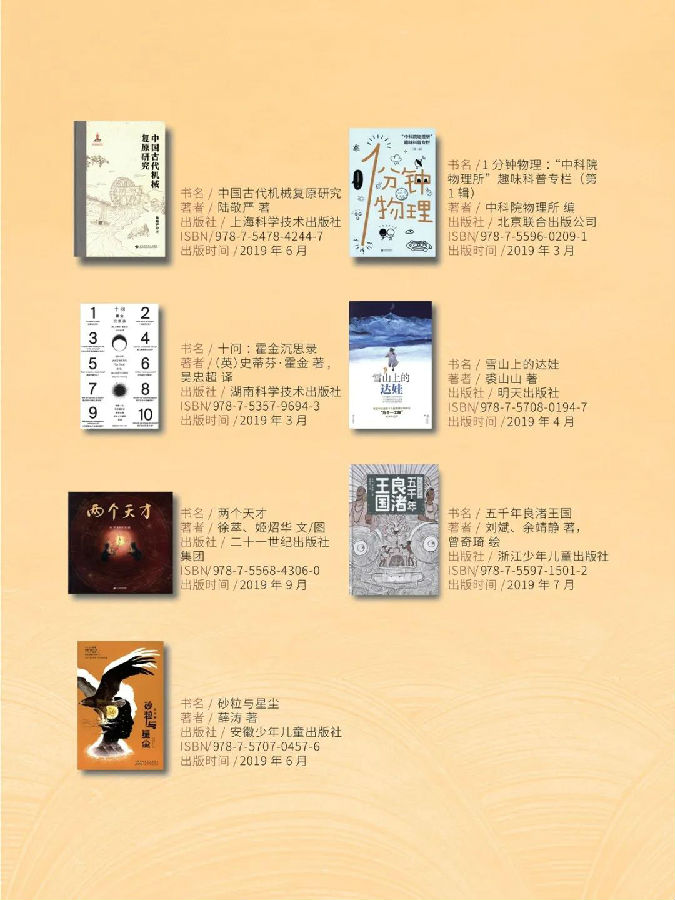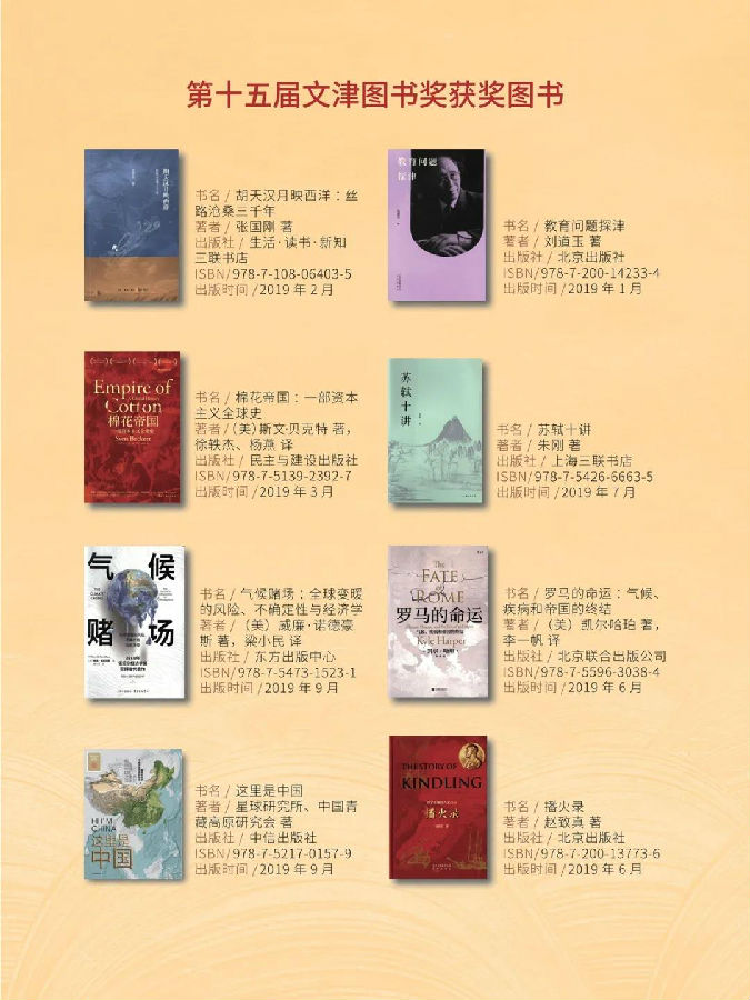 本届获奖图书社科类6种,包括《胡天汉月映西洋:丝路沧桑三千年》《教育问题探津》《棉花帝国:一部资本主义全球史》《苏轼十讲》《气候赌场:全球变暖的风险、不确定性与经济学》《罗马的命运:气候、疾病和帝国的终结》;科普类5种,《这里是中国》《播火录》《中国古代机械复原研究》《1分钟物理:“中科院物理所”趣味科普专栏(第1辑)》《十问:霍金沉思录》;少儿类4种,《雪山上的达娃》《两个天才》《五千年良渚王国》《砂粒与星尘》。另有35种图书被评为推荐图书。