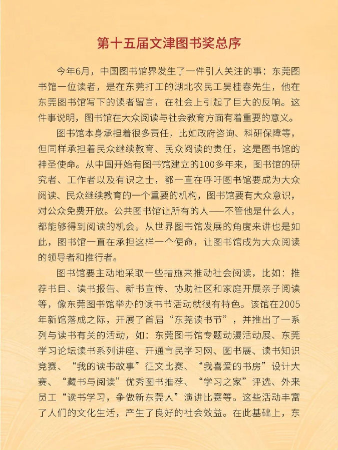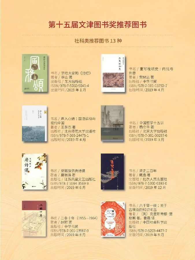 第十五届文津图书奖评选工作于2019年12月3日正式启动,并首次实现网络报送。在推荐阶段,共收到图书馆、出版社、读者、评委等方面推荐的图书1890种,有效参评图书1610种,推荐数量再创新高。其中,有201家出版社参与推荐,68家图书馆参与推荐和初评活动,文津图书奖社会影响力进一步扩大。